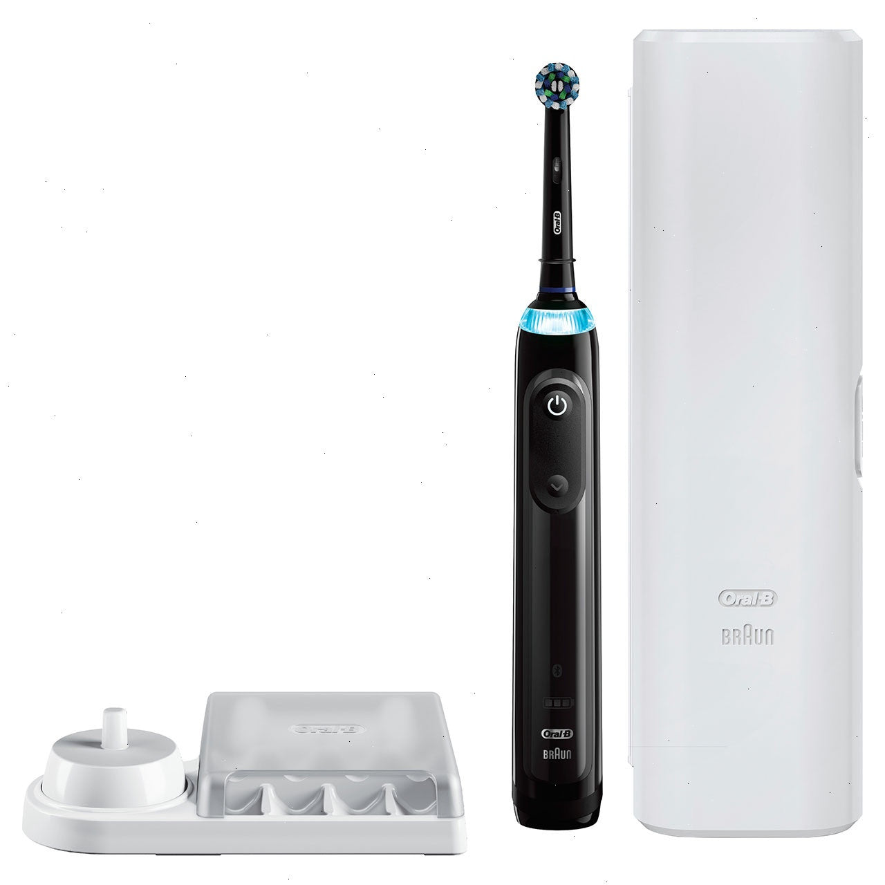 The Oral-B SMART 5000 Power Rechargeable Electric Toothbrush with Bluetooth Connectivity features a CrossAction brush head with bristles that reach deep between teeth for healthier gums.* Bluetooth communication allows the brush to connect with your smartphone to give you real-time feedback on your brushing habits and create a dental care journey based on your oral health goals. The Visible Pressure Sensor on the brush lights up to tell you when you apply too much pressure to your teeth and gums to help prevent harmful over-brushing. The toothbrush features 5 cleaning modes and a timer to help you brush for a dentist recommended 2 minutes. Oral-B SMART 5000 is compatible with a variety of replacement toothbrush heads and includes a convenient travel toothbrush holder.