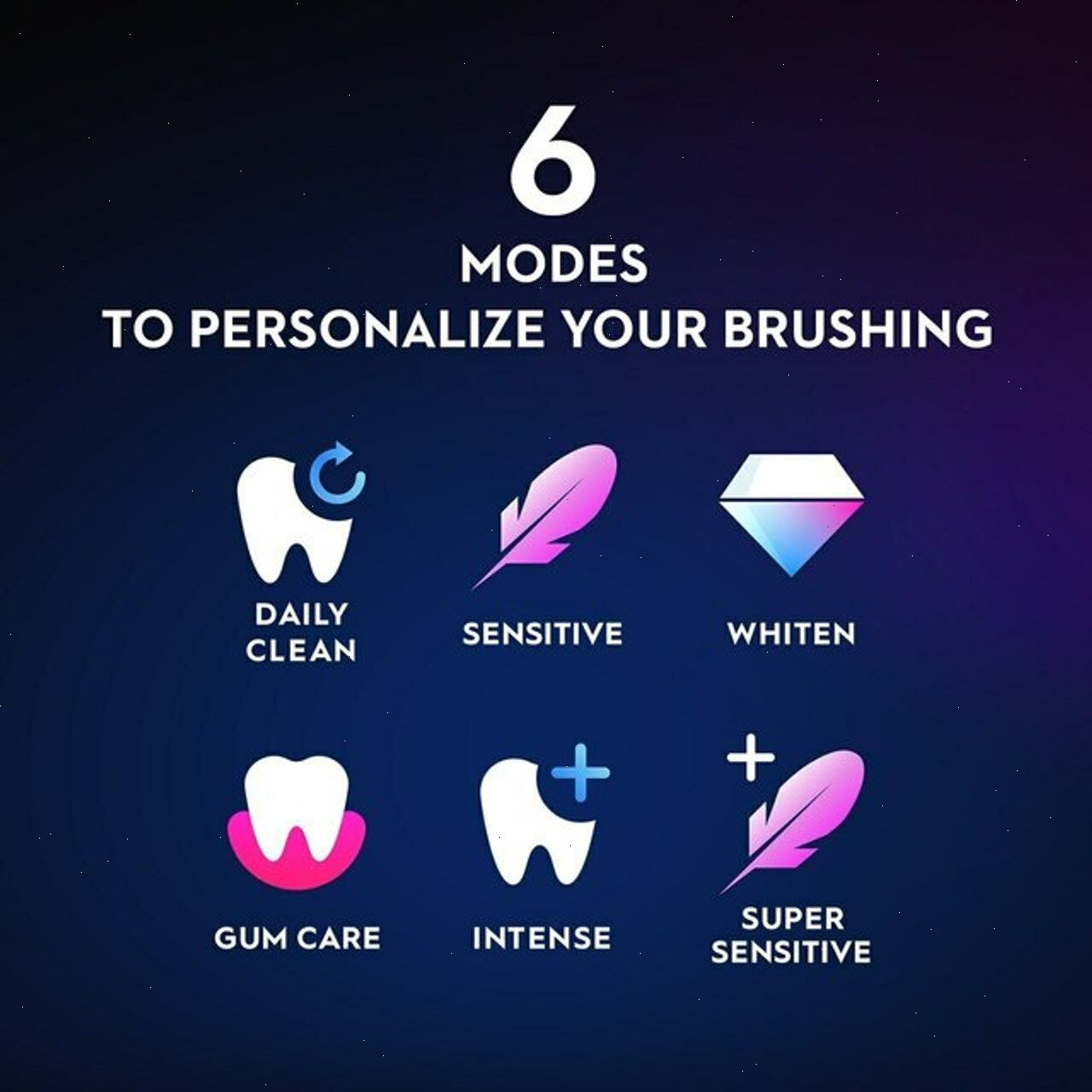 Get a uniquely personalized clean with 6 Smart Brushing Modes including Daily Clean, Whiten, Gum Care, Sensitive, Super Sensitive, and Intense.